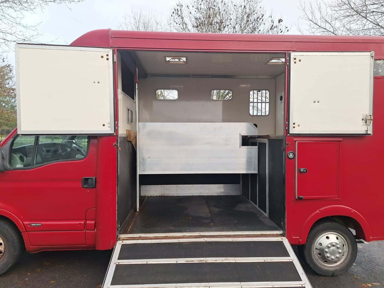 SOLD VAUXHALL MOVANO 3.5 ton gross Coachbuilt on a long wheel base 55 reg 135,000 miles 12 months MOT with 3 minor advisories Super strong build with metal frame and aluminium clad coachbuilt body, with white faced grp panelled interior. Wide 'emergency exit' grooms doors, fully removable breast bar, makes a very simple but safe internal layout. Central partition has adjustable width. The internal design of this box makes it ideal for multi functional transport or indeed as a trade display vehicle at events for a business such as a tack shop . Horse standing is 7ft 2in chest to tail and 7ft 6in head height, suitable for large horses. Payload is 1020kilos (weighbridge certificate provided). £12,000 ono More photos available on request